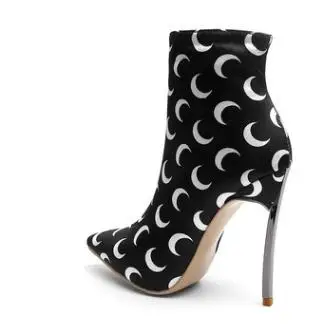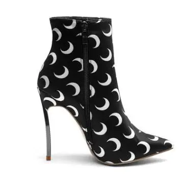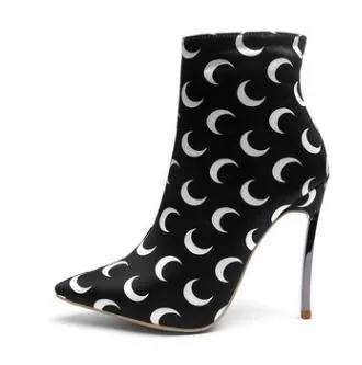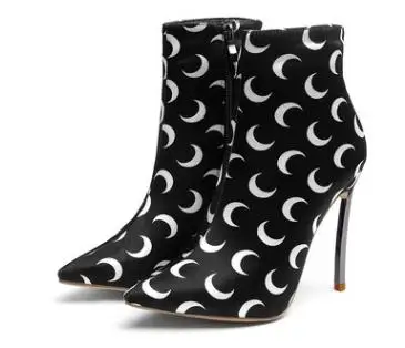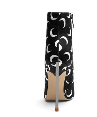The Black Ankle Boots with White Moon Print are a unique and fashionable choice for ladies who want to make a statement with their footwear. The combination of the black color, white moon print, pointed toe, and thin high heels creates a stylish and eye-catching look that is sure to turn heads and elevate any outfit. Whether you’re dressing up for a special occasion or adding a touch of flair to your everyday style, these ankle boots are a chic and on-trend option.