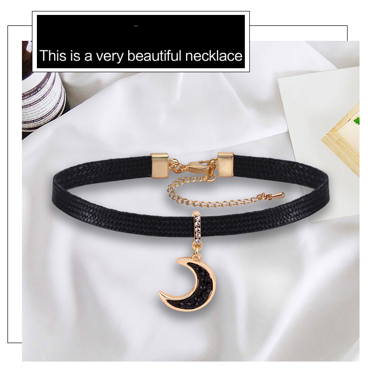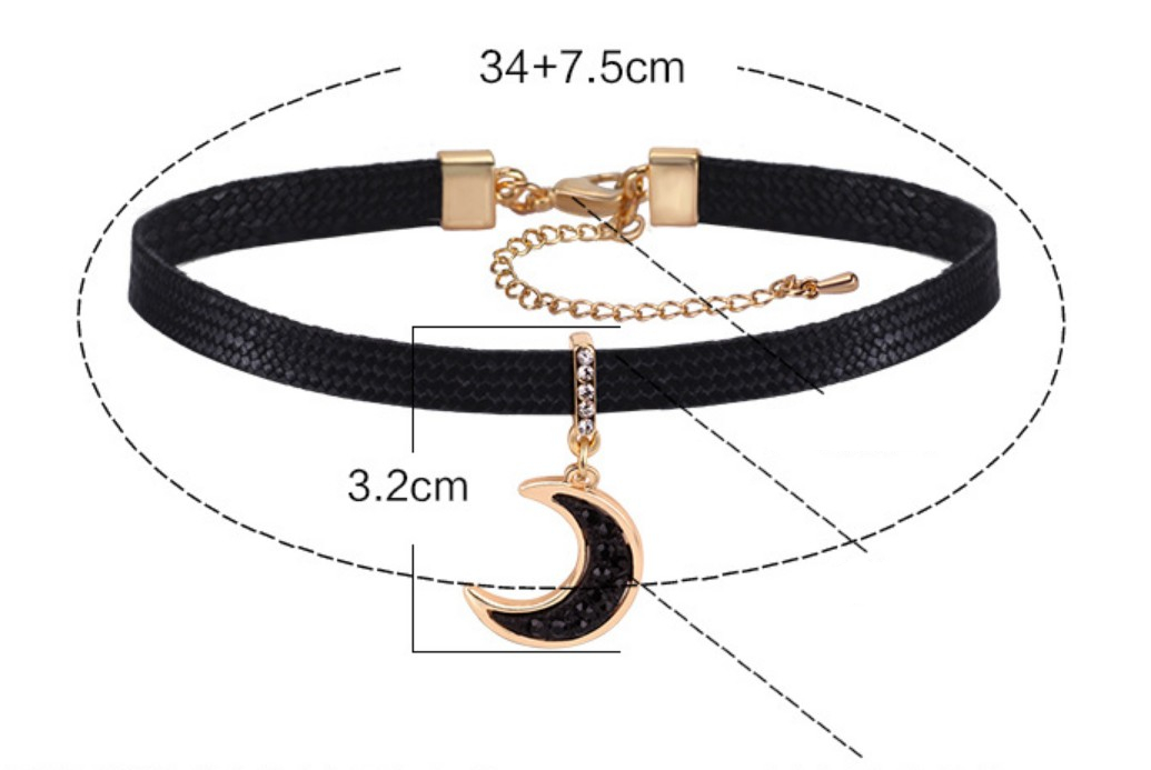 The black leather choker and moon pendant create a harmonious contrast, with the dark looking leather providing a bold backdrop for the shimmering moon pendant. The combination of leather looking material and gold looking metal creates a stylish and edgy aesthetic, making it a versatile accessory that can be worn with various styles, from casual to more formal occasions.