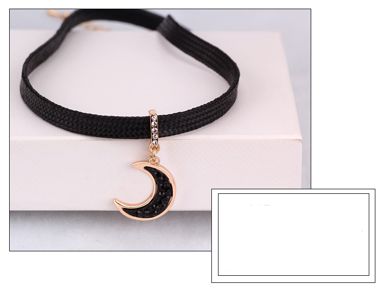 The highlight of the necklace is the moon pendant, which serves as a captivating focal point. The moon pendant is made of metal alloy, featuring intricate details that depict the phases of the crescent moon. The pendant is finished with a sleek black and golden tone, adding a touch of sophistication to the overall design.