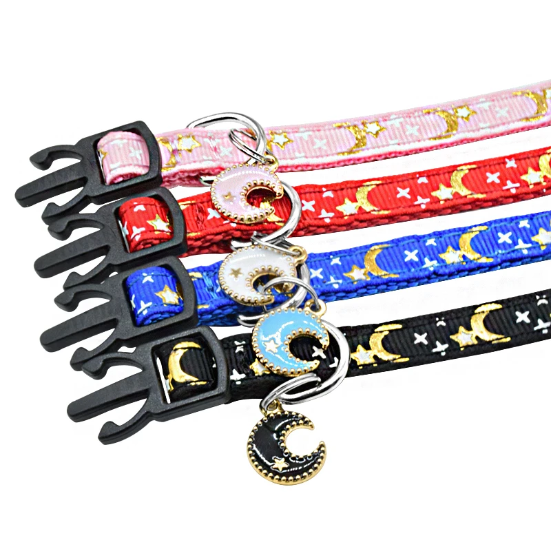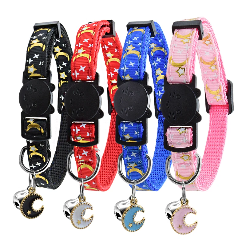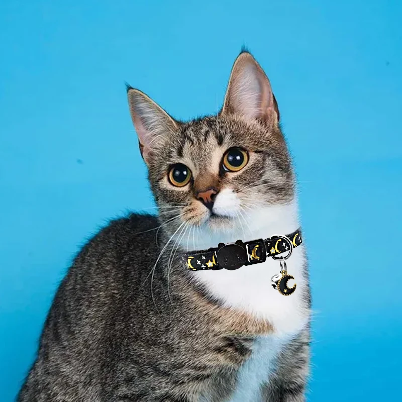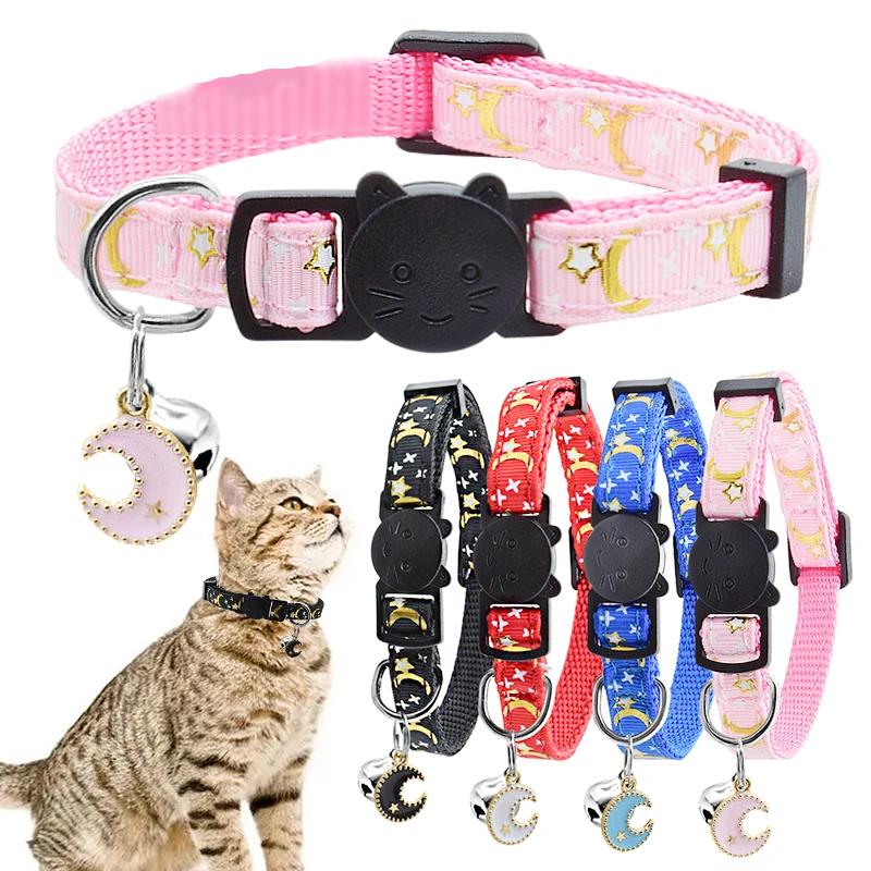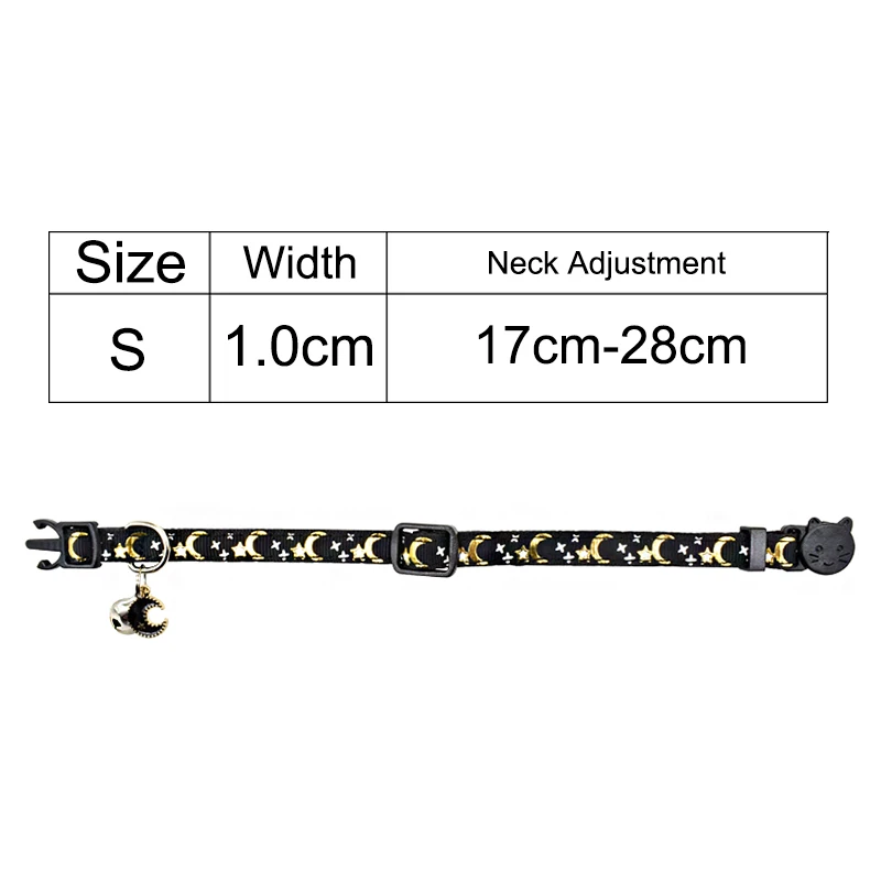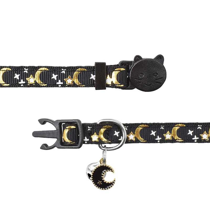 The Cute Moon Cat Collar is designed to adorn your beloved pet with style and comfort. This collar combines motifs of a cat, moon, and stars. It contains a bell and a moon pendant. The adjustable design guarantees a snug fit for cats of all sizes, allowing them to roam and explore in style.