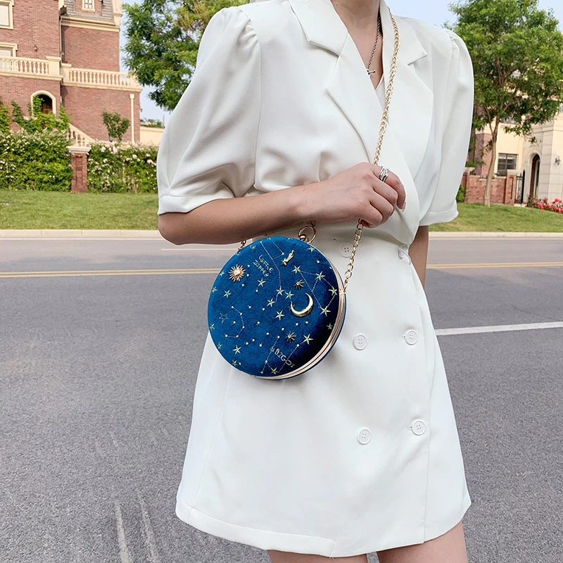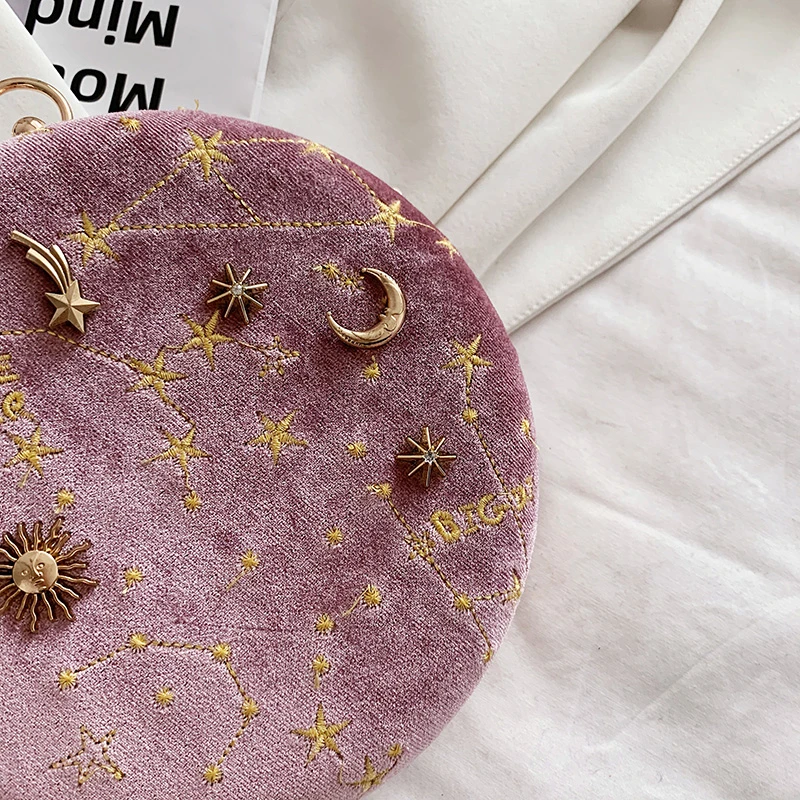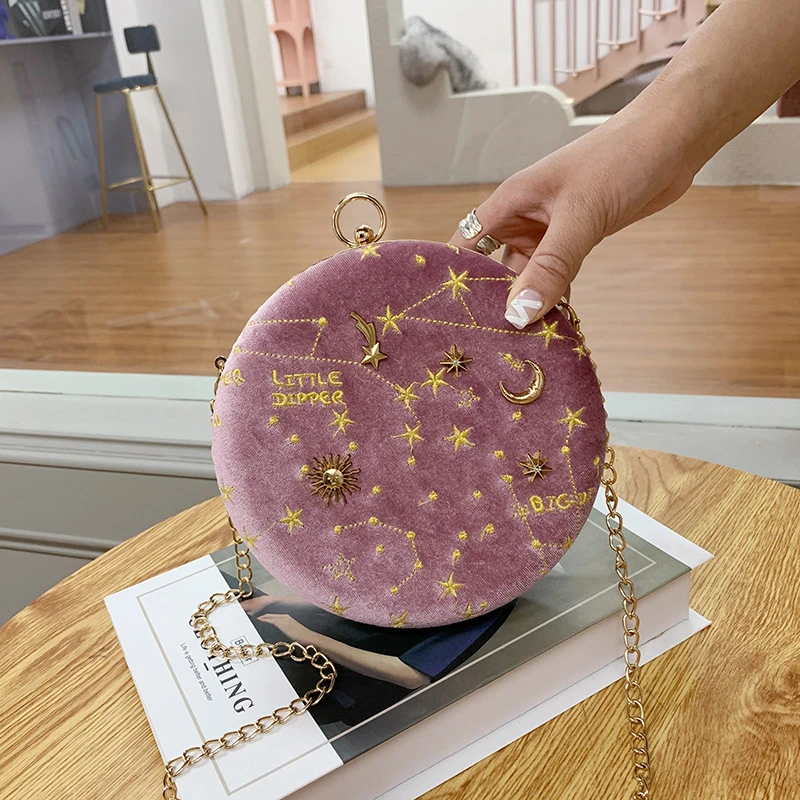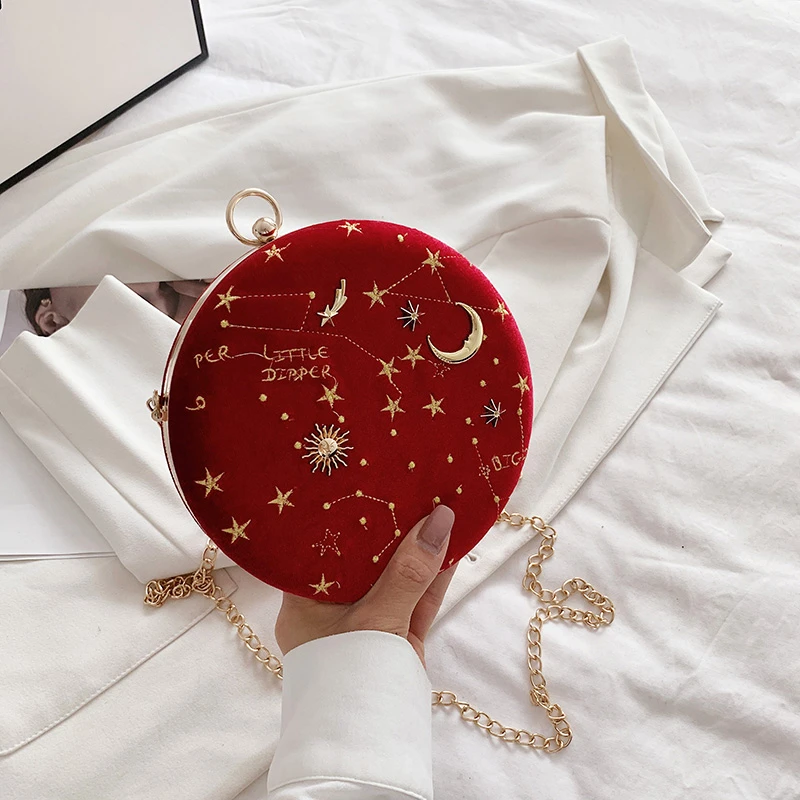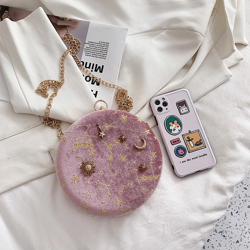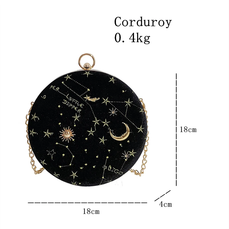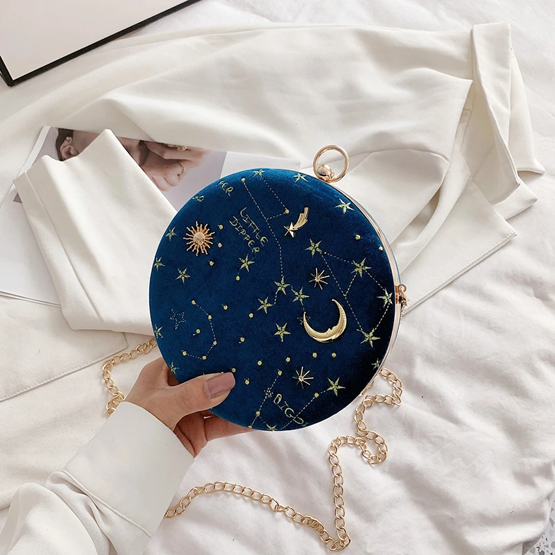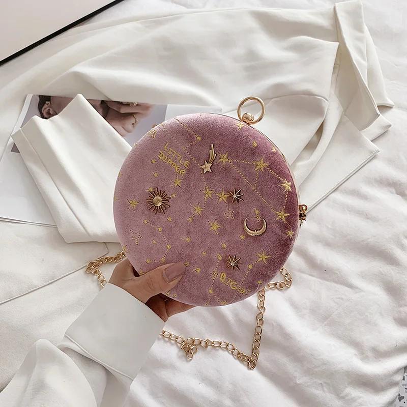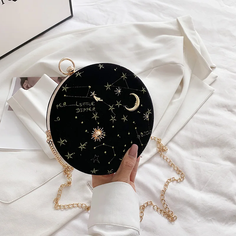 The moon and starry sky pattern chain bag is a purse that features a unique design inspired by the celestial world. The bag has a round shape, and is adorned with a pattern that includes images of a moon and stars against a dark blue, black, pink or red background resembling a starry sky.