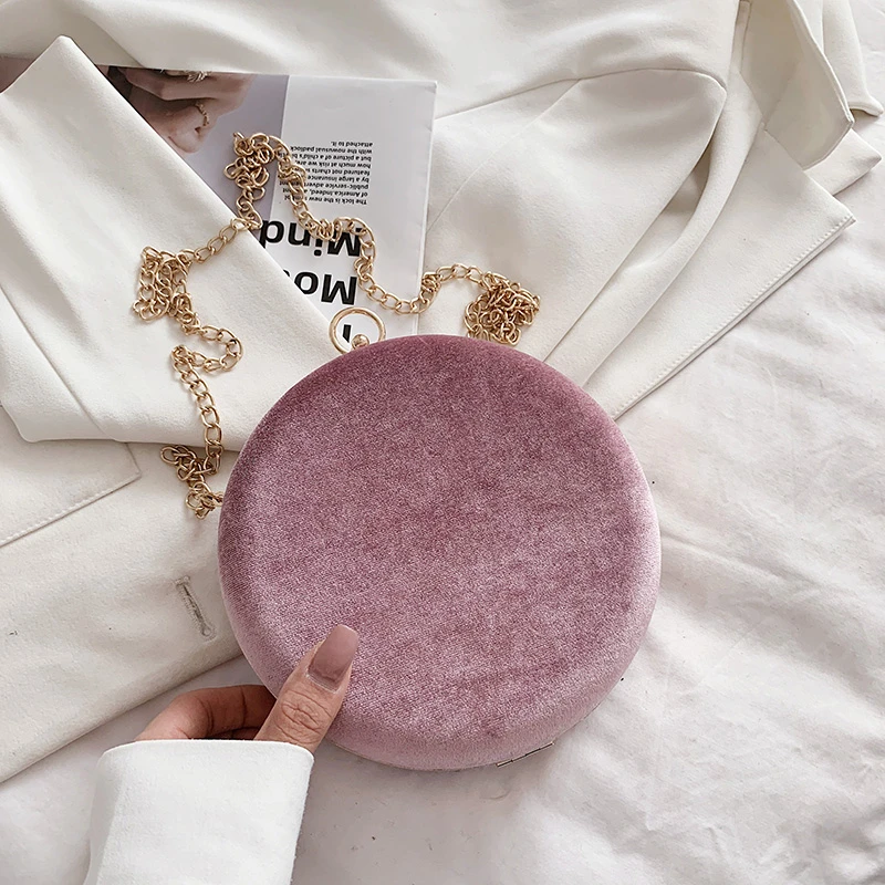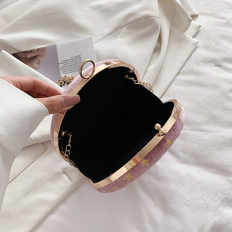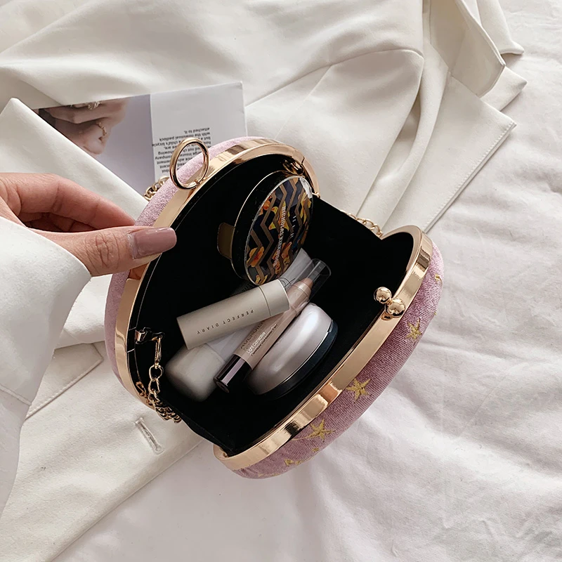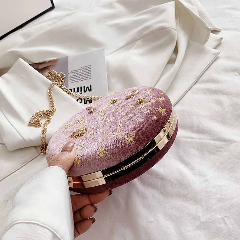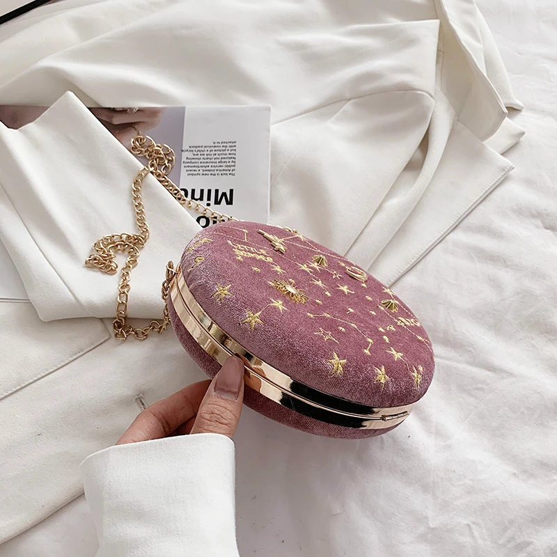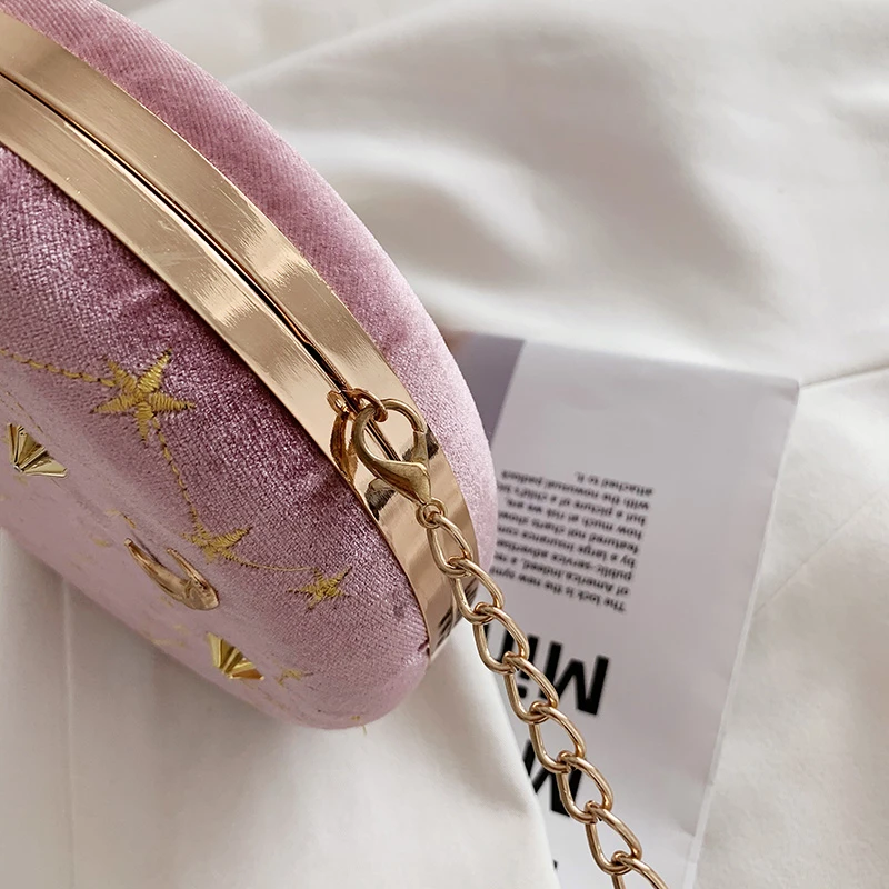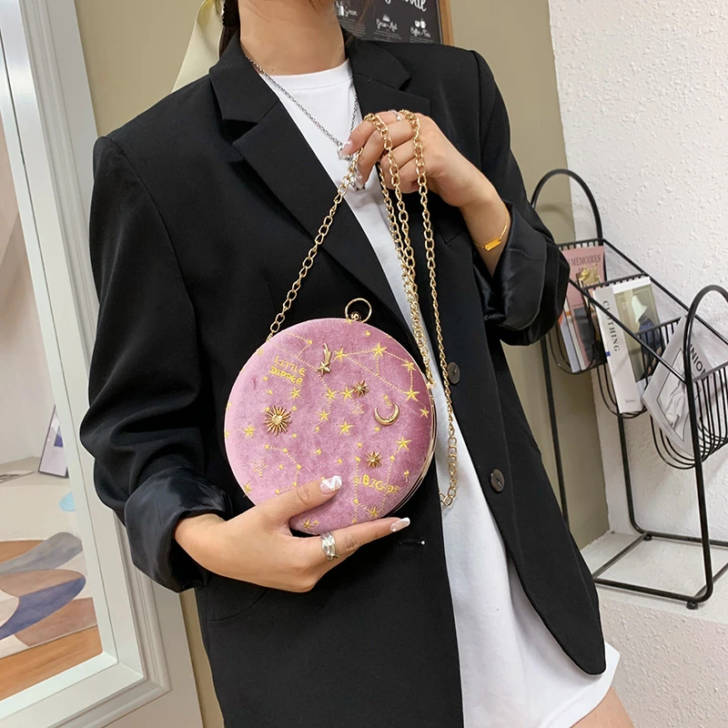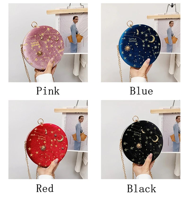 The moon and starry sky pattern chain bag is a purse that features a unique design inspired by the celestial world. The bag has a round shape, and is adorned with a pattern that includes images of a moon and stars against a dark blue, black, pink or red background resembling a starry sky.