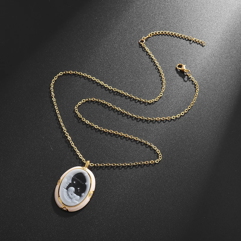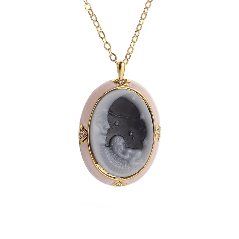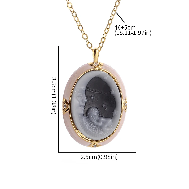 The Moon Goddess Angel Baby Necklace is a whimsical fusion of charm and romance, encapsulated in an exquisite oval pendant. This enchanting piece invites you into a lovely dreamscape, where a crescent moon cradles a sleeping angelic baby amidst a constellation of twinkling stars.