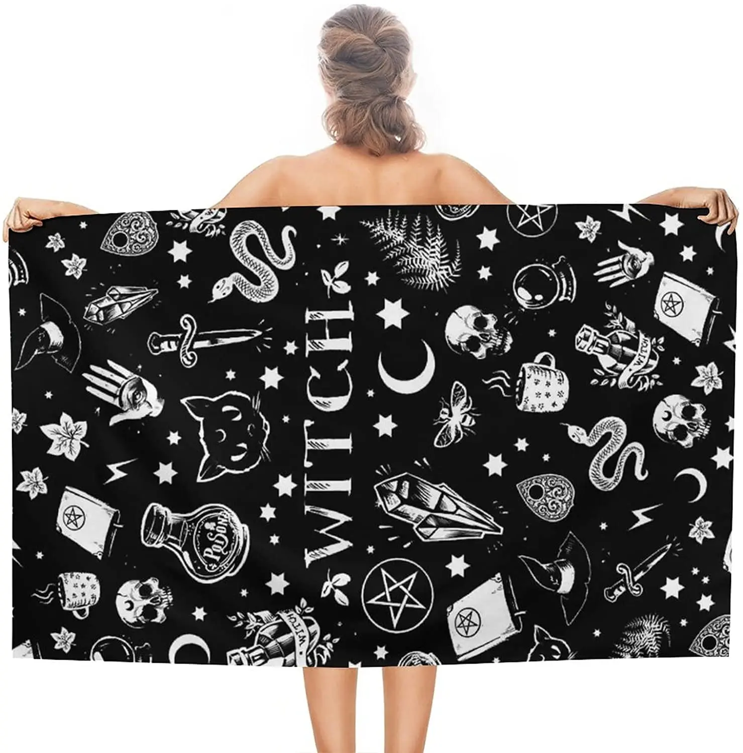 Magical Cat Moon Gothic Pattern: The towel showcases an enchanting design with a mystical cat and crescent moon, perfect for those who appreciate gothic aesthetics and whimsical art.