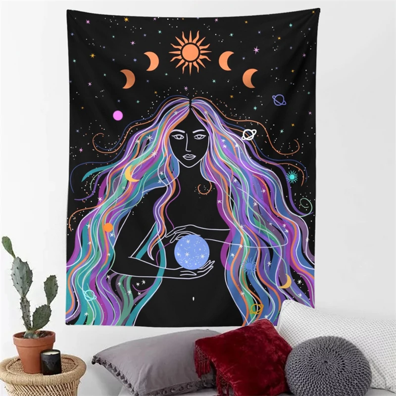 The Moon Phase Girl Tapestry is a captivating piece of decor that adds a touch of celestial charm to your space. This beautifully designed tapestry features intricate illustrations of a moon phase girl, creating a mystical and enchanting atmosphere. The Moon Phase Girl Tapestry is made from high-quality materials. It brings both durability and artistic flair to your room.