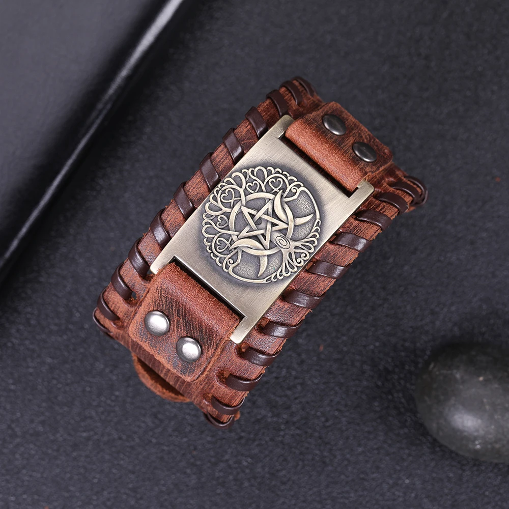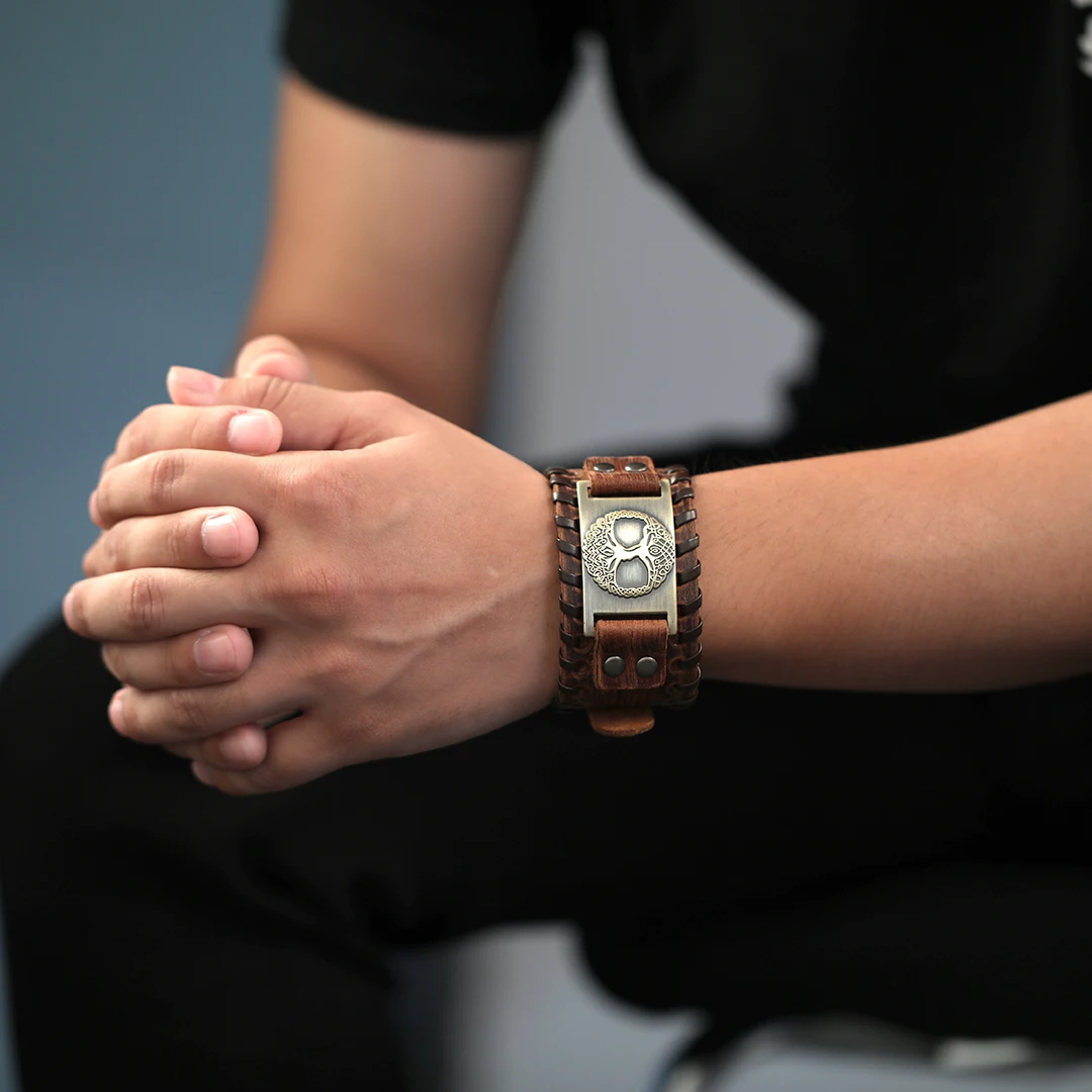 The Nordic Triple Moon Bracelet is wide leather wristband. Ancient and medieval in style. Designed for men seeking timeless fashion.