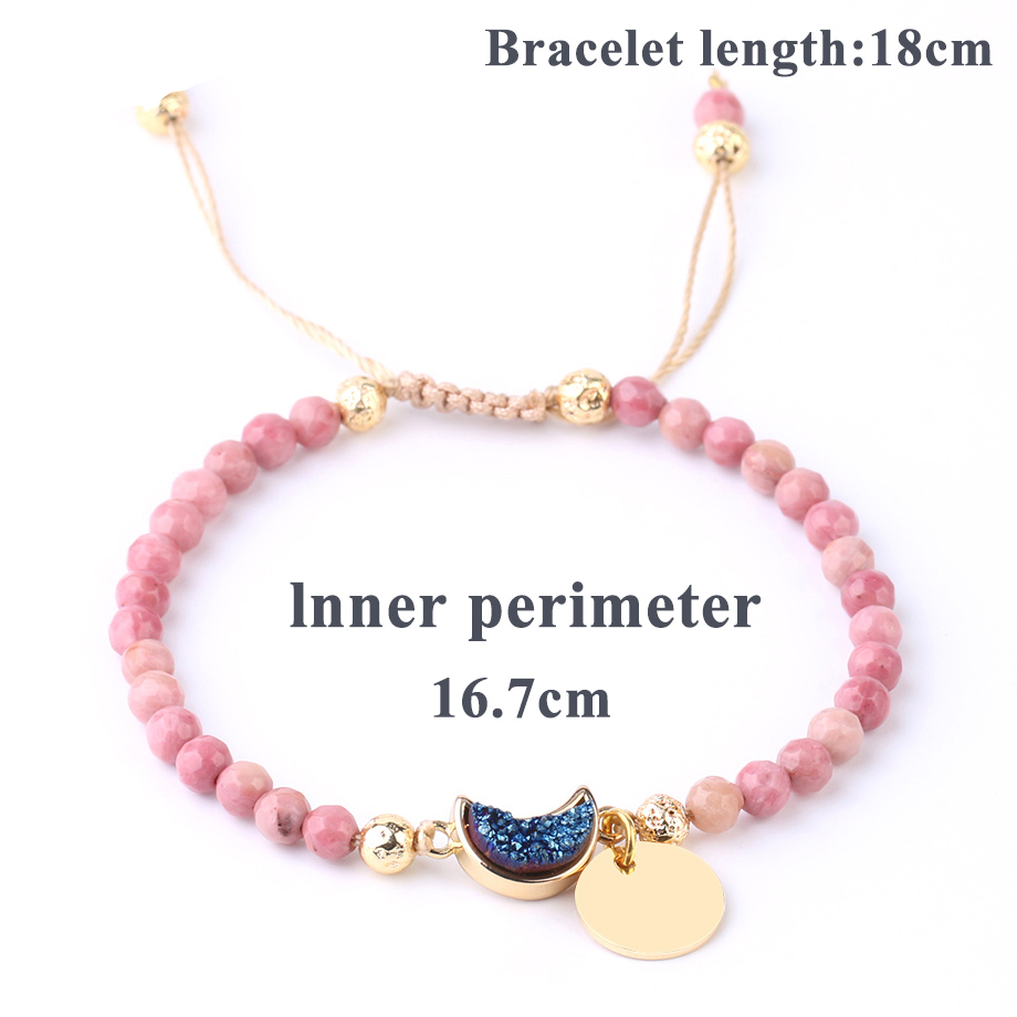 The highlight of the bracelet is the blue moon charm, which adds a touch of moon magic to the design. The blue moon charm is made of a high-quality metal alloy, and its rich blue color evokes the mystery and allure of the moonlit night sky. The moon charm serves as a focal point and creates a striking contrast against the pink stones, adding visual interest and a unique element to the bracelet.