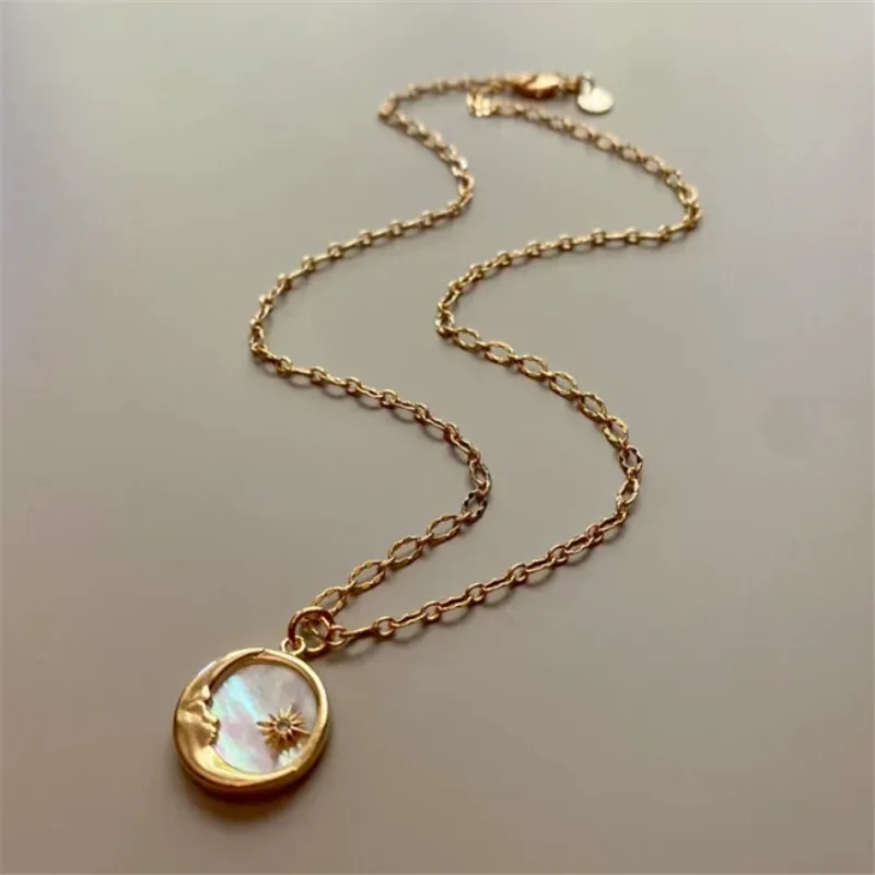The Round Sun Moon Necklace features a white shell designed in the shape of a round coin.