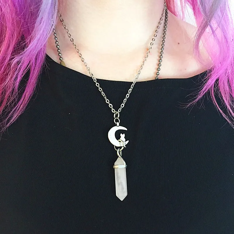The moon shape is a crescent, and is embellished with a cat to create a unique and eye-catching design. The pendant is suspended from a delicate chain. The Stone Moon Crystal Pendant Necklace is a popular fashion accessory, often worn as a statement piece to add a touch of elegance and sophistication to any outfit. Additionally, crystals may support have healing thoughts, making this necklace not only a stylish accessory but also a potential source of spiritual and emotional support.
