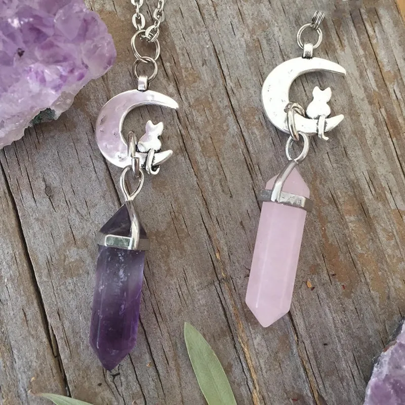 The Stone Moon Crystal Pendant Necklace is a piece of jewelry that features a pendant in the shape of a moon and a cute little cat on top. The hanging crystal stone completes the image. The stone is cut and polished to create a smooth and shiny surface, and comes in two colors, which are rose and purple.