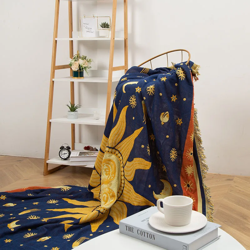 The Sun Moon Star Blanket is a cozy and magical addition to your home. This beautifully designed blanket has a pattern with suns, moons, and stars. It is designed to create a soothing and magical ambiance. Made from soft and warm materials. It provides comfort and style for your relaxation moments.