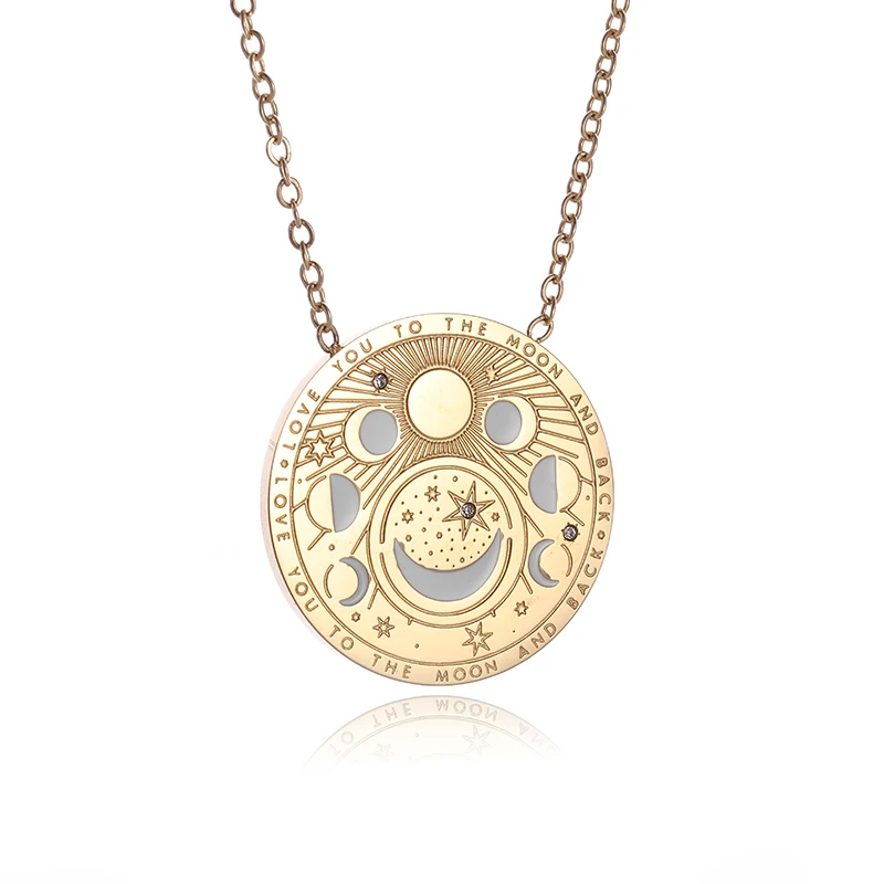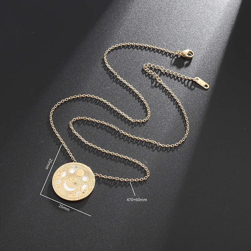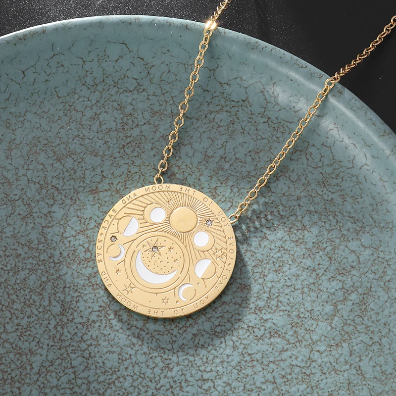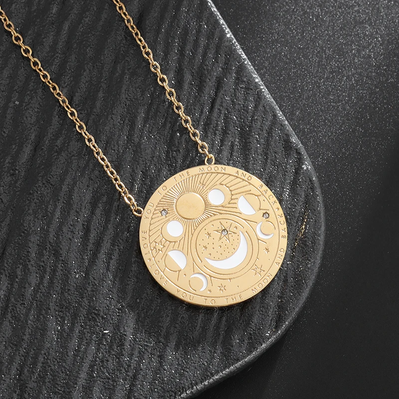What sets this necklace apart is the intricate engraving of the sun, all moon phases and stars, transforming it into a wearable masterpiece that mirrors the captivating dance of celestial bodies above. The moon, from delicate crescents to the full lunar glow, is meticulously detailed. It is creating a visual ode to the celestial cycle. Accompanying stars twinkle in harmony, adding a touch of ethereal brilliance to the design.