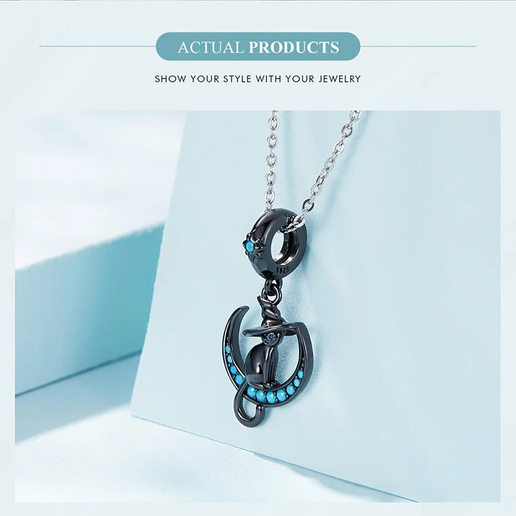 The design features a series of alternating black beads and blue-tone spacer beads that create a striking contrast. The charm of the black cat that is sitting on a crescent moon is intricately detailed, with a witch hat, a curled tail, and glowing eyes that add a touch of mystical charm.